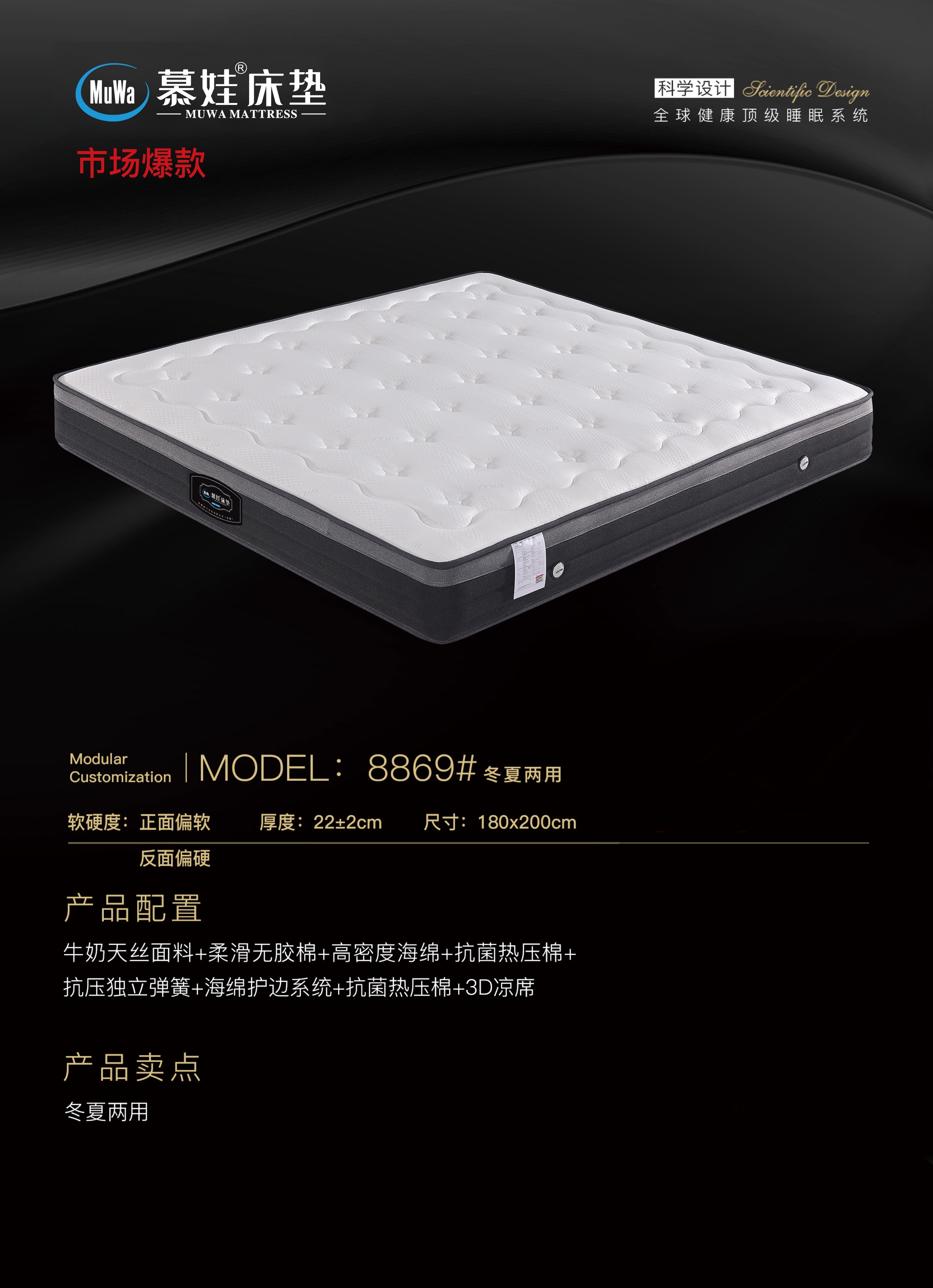 推荐理由① 产品结构科学,采用“全层协同”设计,兼顾舒适、支撑与健康,非简单堆料。 ② 核心材料应用领先,如记忆棉精准释压、3D材料循环透气,技术差异化明显。 ③ 具备抗菌防螨的实质性解决方案,符合当前市场对健康睡眠的升级需求。 ④ 工厂直供模式,减少了中间环节,在成本与品质控制上更具优势。 ⑤ 支持柔性化生产,能适应B端客户对规格、软硬度的不同定制要求。