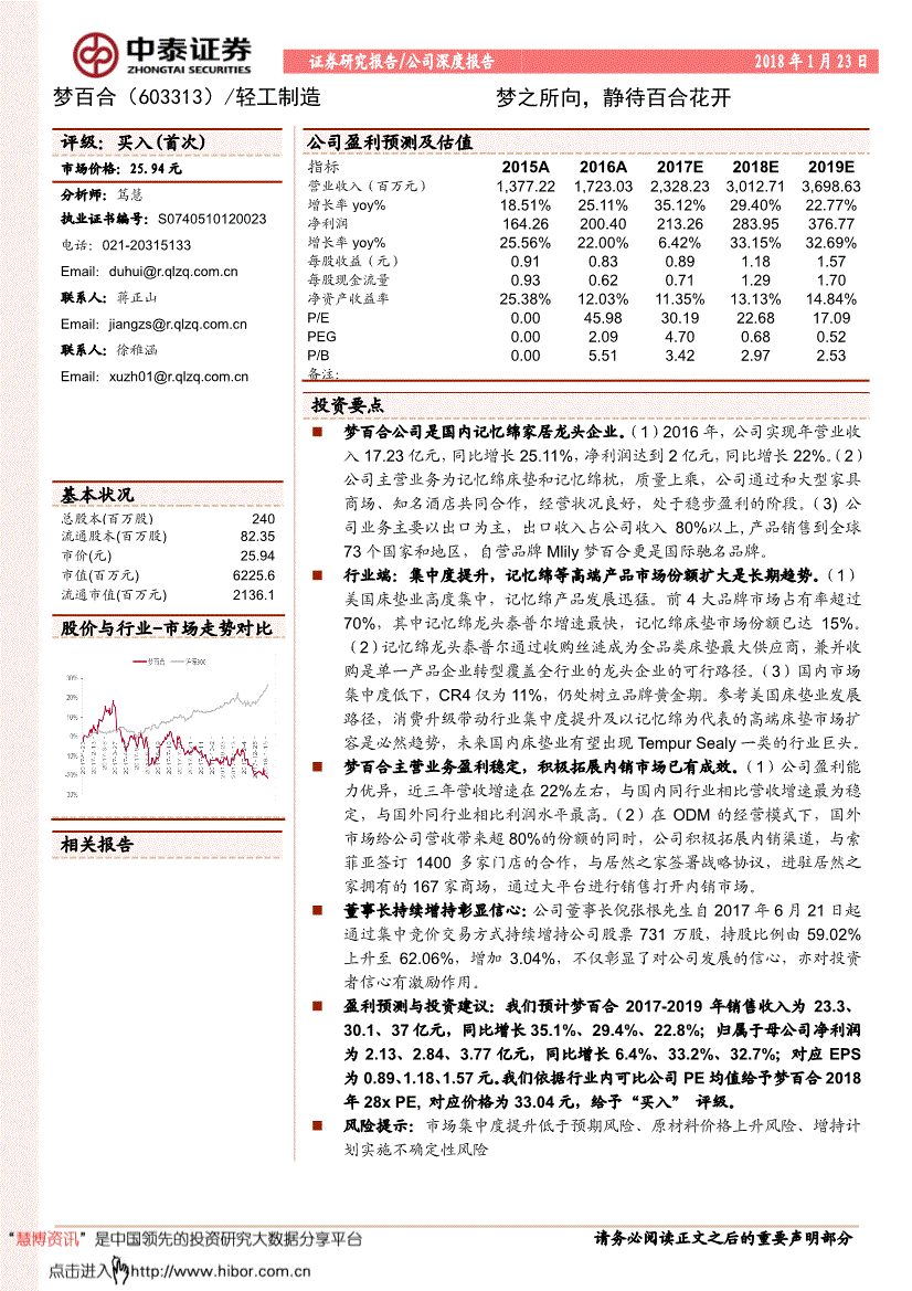公司是国内记忆绵家居龙头企业。【慧博投研资讯】(1)2016年,公司实现年营业收入17.23亿元,同比增长25.11%,净利润达到2亿元,同比增长22%。(慧博投研资讯)(2)公司主营业务为记忆绵床垫和记忆绵枕,质量上乘,公司通过和大型家具商场、知名酒店共同合作,经营状况良好,处于稳步盈利的阶段。(3)公司业务主要以出口为主,出口收入占公司收入80%以上,产品销售到全球73个国家和地区,自营品牌Mlily梦百合更是国际驰名品牌。行业端:集中度提升,记忆绵等高端产品市场份额扩大是长期趋势。(1)美国床垫业高度集中,记忆绵产品发展迅猛。前4大品牌市场占有率超过70%,其中记忆绵龙头泰普尔增速最快,记忆绵床垫市场份额已达15%。(2)记忆绵龙头泰普尔通过收购丝涟成为全品类床垫最大供应商,兼并收购是单一产品企业转型覆盖全行业的龙头企业的可行路径。(3)国内市场集中度低下,CR4仅为11%,仍处树立品牌黄金期。参考美国床垫业发展路径,消费升级带动行业集中度提升及以记忆绵为代表的高端床垫市场扩容是必然趋势,未来国内床垫业有望出现TempurSealy一类的行业巨头。